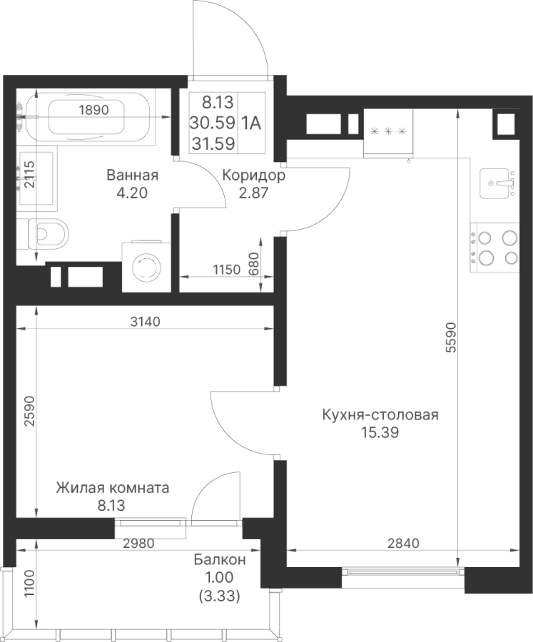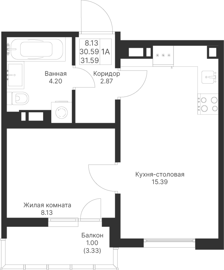 1-к квартира 31.59 м²