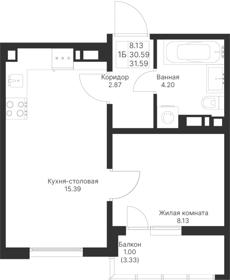 1-к квартира 31.59 м²